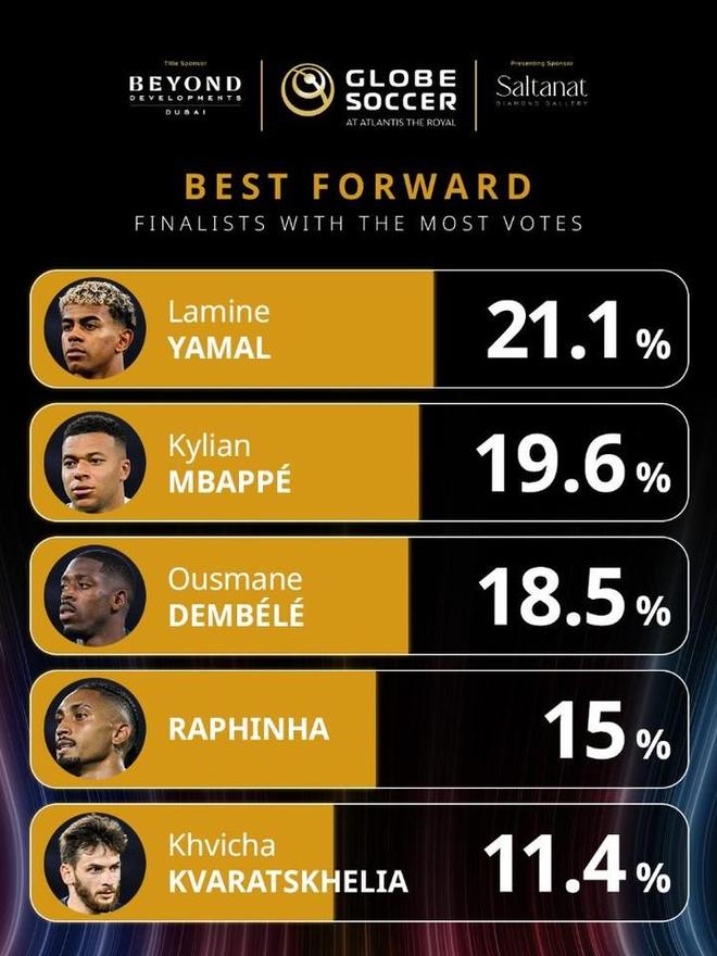 环足奖2025年最佳前锋投票:亚马尔第一,姆巴佩、登贝莱二三